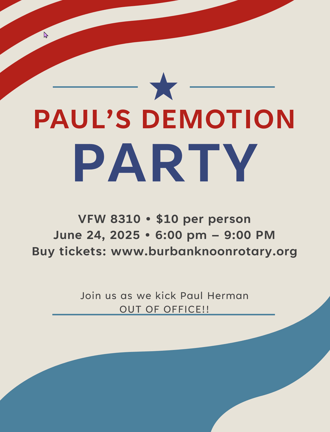 We aren't having a lunch meeting today. Please join us for our demotion party tonight! Please purchase tickets here, so we order enough food.